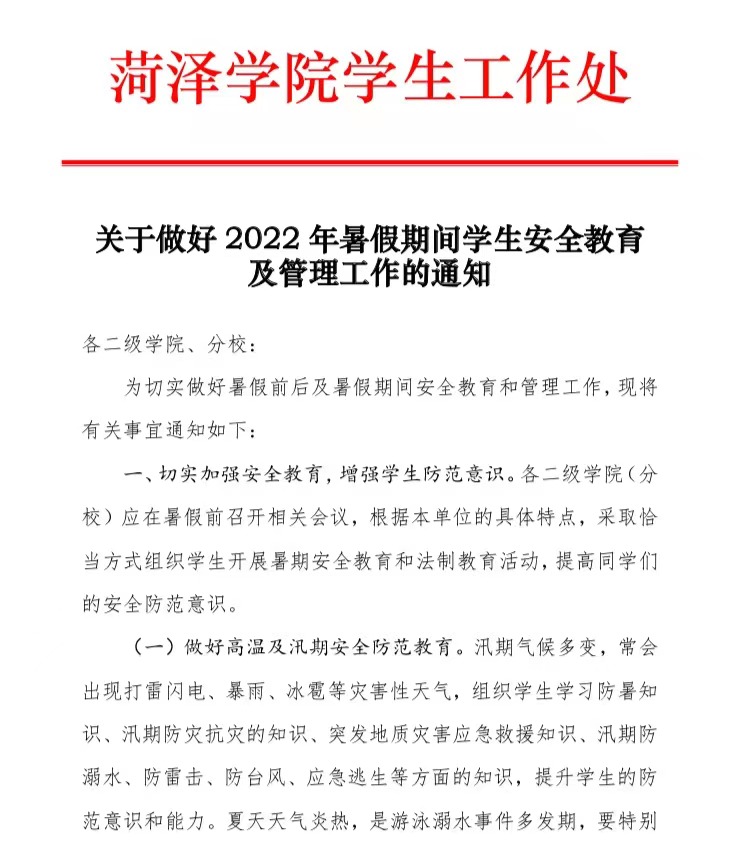 关于做好2022年暑假期间学生安全教育管理工作的通知