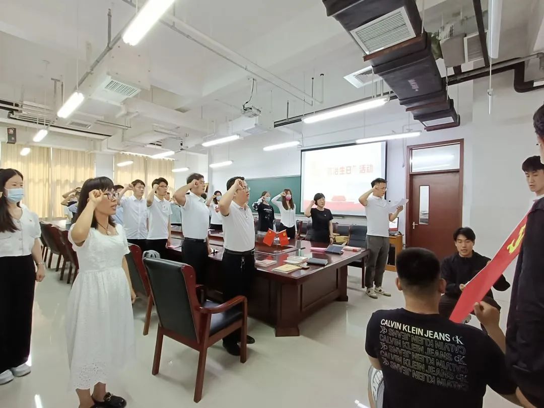 本次活动共三个环节。活动伊始,党委副书记刘夏菡寄语毕业生党员,并赠送毕业生党员“信仰礼包”,刘夏菡给出毕业生党员三点建议和嘱咐,珍惜健康、保持终身学习的态度和堂堂正正做人,并用北大教授寄语告知毕业生党员如何做到以上三点。随后,由学生第一党支部书记陈伟和第二党支部书记汤洪震为8名党员同志过政治生日给予祝福,并颁发红色书籍和贺卡。最后,由汤洪震带领全体党员重温入党誓词,守护初心承诺,以满腔热血奔赴新的征程。所有党员同志用热烈的掌声表达对本次活动的赞同和感谢。