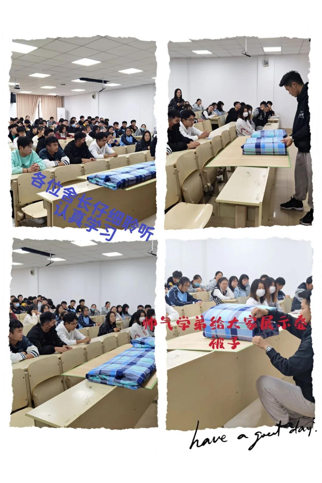 大会第一项,由2021级宿舍整理优秀代表商子晗进行叠被子展示,在叠被子过程中,他细心的讲解了在叠被子过程中需要注意的细节,他表示叠被子需要讲究“三分叠、七分修”。大会进行第二项,由宿管部宋华宇讲解宿舍管理条例,他强调宿舍安全无小事,宿舍卫生打扫同样不能忽视。大会第三项薛源指出了在院检查出现的问题,对具体内务问题和标准进行了详细讲解。就新生近期的宿舍内务现状问题、如何落实宿舍整顿内务经验方法等进行介绍,让舍长们对宿舍内务整顿,相关执行措施有了明确的方向。大会第四项邵炳衡指出宿舍长作为心理朋辈辅导员培养对象,既要明确身份职责,也要勇于担当,在老师与学生之间联系肩负起重要的沟通桥梁作用。