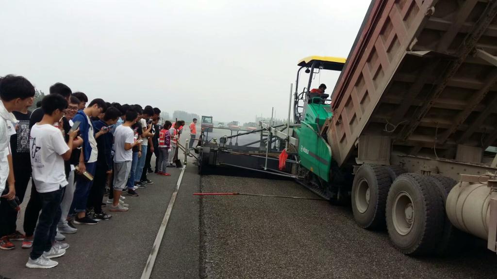31日上午,实习队伍首先来到了菏泽机场路的施工现场,负责该道路施工的陈衍起总工程师向同学们详细介绍了机场路的概况。机场路全长6.44公里,西起德商高速互通立交桥,东至菏泽市飞机场,以城市快速路A级的设计标准为依据,采用双向八车道,道路结构层设为四层,路面材料采用SMA-13。同学们在现场看到摊铺机正在对路基水泥基层进行铺设,就什么是SMA-13、它与普通的沥青混凝土相比其优势以及在道路施工中如何确保路拱的设置和弯道超高设置等诸多问题积极地询问。走到路的前方,参观了正在建设中的机场,观看了现场正在施工的路基路面。随后乘车赶往中建三局一公司承建的人民路互通立交桥,总工师带领大家边看边讲,告诉同学们水下桥墩、承台该如何施工以及桩的深度、拆装模板等问题,使同学们受益匪浅。