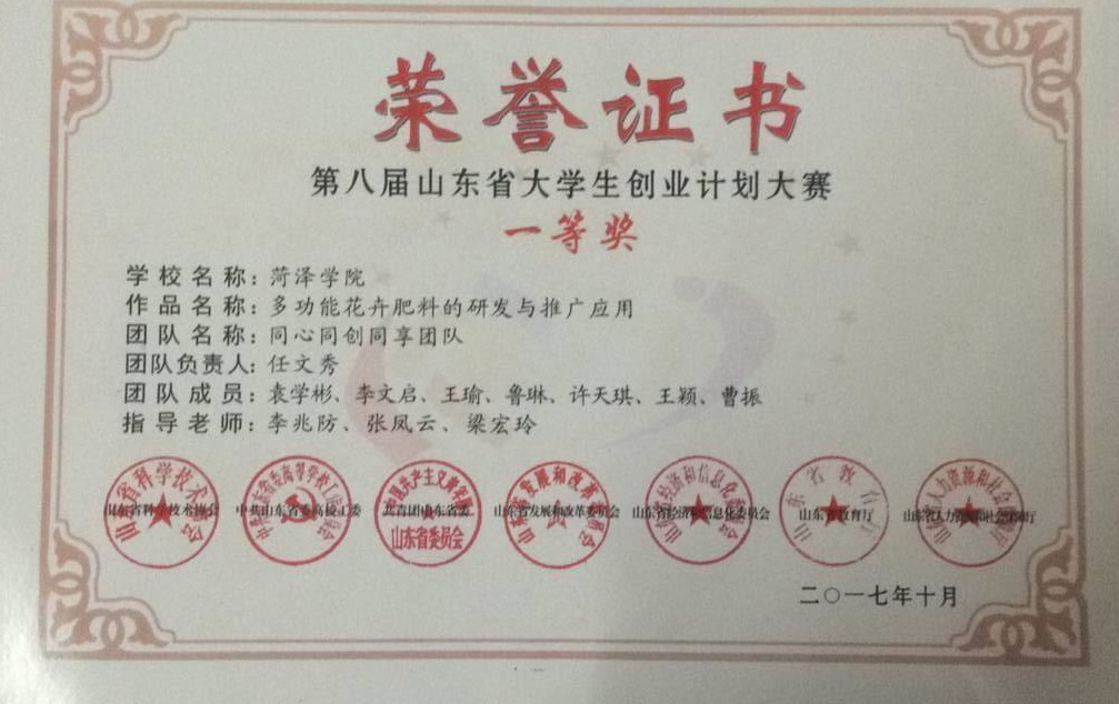大赛由山东省科学技术协会、中共山东省委高等学校工作委员会、共青团山东省委、山东省发展和改革委员会、山东省经济和信息化委员会、山东省教育厅、山东省人力资源和社会保障厅主办,山东大学协办。旨在为深入贯彻落实“大众创业、万众创新”发展战略,更好地激发大学生的创新精神和创业热情。大赛共有来自山东大学、山东科技大学等50多个大专院校参加,参赛项目达1200余件,大赛设特等奖7项,一等奖45项,beat365官网申报的《多功能花卉肥料的研发与推广应用》创业计划项目通过专家的初审、详审、复核后名列第10,荣获一等奖。李兆防、张凤云、梁宏玲三位老师获得优秀指导教师奖。