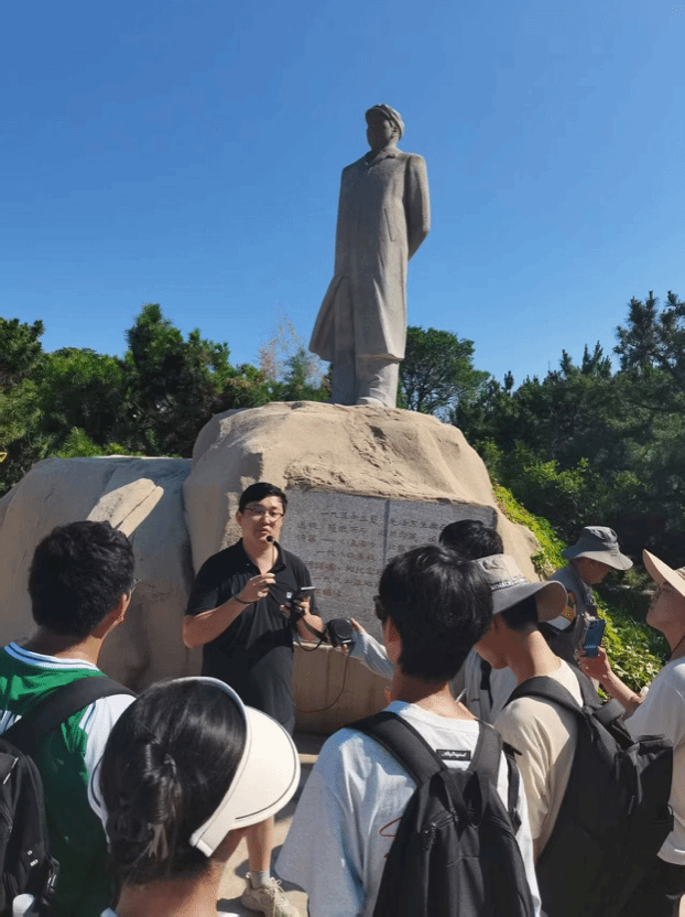 在鸽子窝公园,院团委书记刘兴飞老师在伟人广场毛泽东石像处开展了一次别开生面的“野外思政教育”活动,介绍了《浪淘沙·北戴河》的来源,结合本次专业的实习特征对长征精神进行了讲解。正如长征精神中“不怕任何艰难险阻,不惜付出一切牺牲”,本次实习的路线再苦再难,没有一位学生掉队,每次都能成功登顶;大家都做到了“顾全大局、严守纪律、紧密团结”,大家都遵守纪律,确保实习顺利开展,互帮互助,结成了深厚的友谊。刘兴飞勉励同学做一位能吃苦耐劳、志存高远的新时代青年,最后刘兴飞带领大家在红旗下、伟人前诵读了《浪淘沙·北戴河》,全体学生情绪高昂、备受鼓舞。