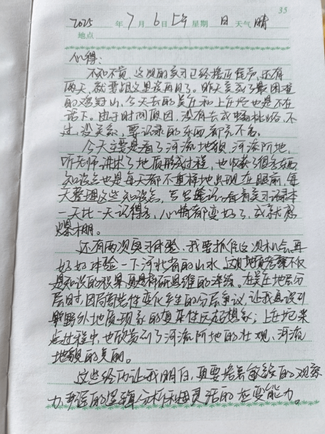 在吴庄,我们通过观察和记录,在识别不同岩层方面,积累了更多的实践经验。在大石河,我近距离观察了河流的地貌特征,看到了河漫滩、阶地等地貌单元,对河流的侵蚀、搬运和堆积作用有了更直观地认识。