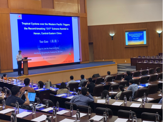 高涛教授在“主题12、大气物理与气象气候”中的“热带海气相互作用与大气水循环”专题做题目为《Tropical Cyclone over the Western Pacific Triggers the Record-breaking“21/7” Extreme Rainfall in Henan, Central-Eastern China》的报告,介绍了高涛教授课题组在热带气旋远距离降水效应研究上取得的最新进展。热带气旋的远距离降水效应是指台风在上千千米之外其造成降水虽然发生在距离台风上千千米之外,且降水强度较大甚至超过台风本体自身极端降水的现象,从而引发城市内涝、坍塌滑坡、泥石流等严重灾害。2021年7月17日至23日,河南省所遭遇的破历史记录的“21/7”特大暴雨事件,便与远在千里之外西太平洋上的台风“烟花”的远距离降水效应有关。高涛教授课题组及其合作者以“21/7”特大暴雨事件为研究对象,利用云解析分辨率区域海-气耦合模式,结合集合预报和水汽收支方法,定量分析了台风“烟花”的远距离降水效应对“21/7”特大暴雨事件的贡献。该成果已在国际学术期刊《Environmental Research Letters》上发表。