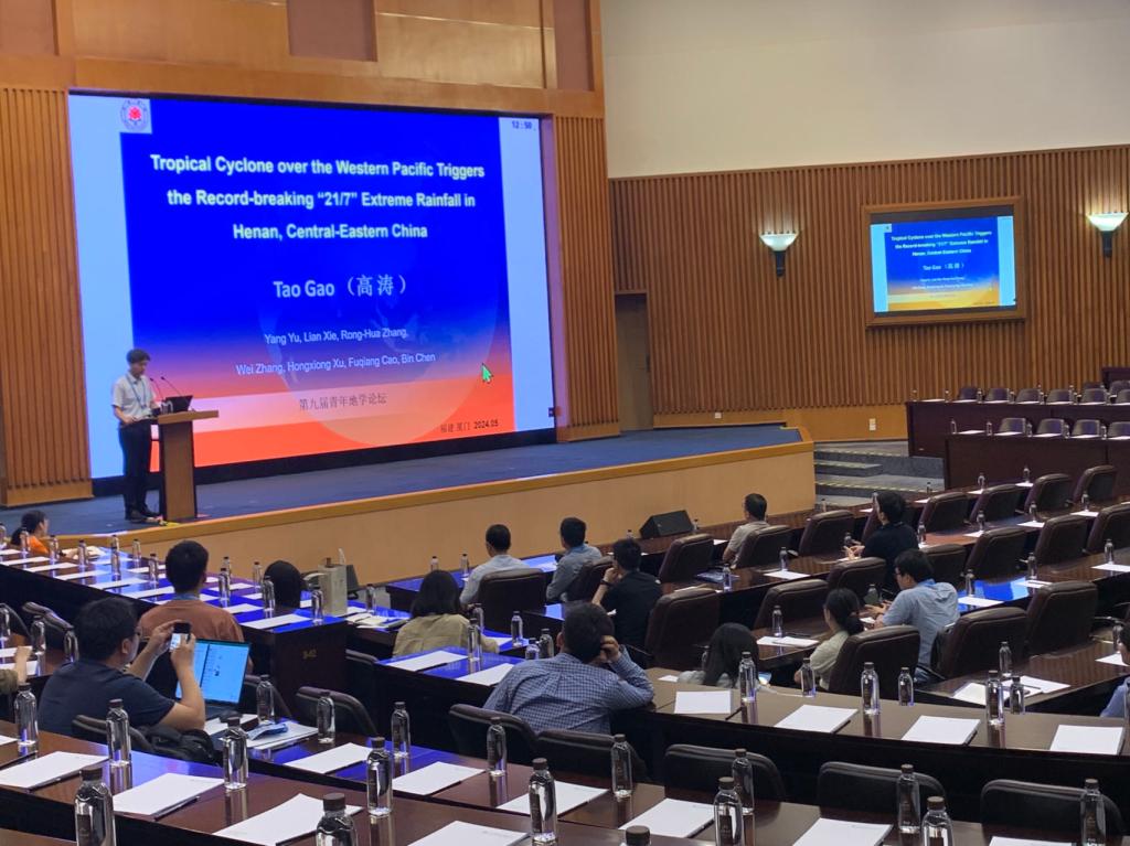 高涛教授在“主题12、大气物理与气象气候”中的“热带海气相互作用与大气水循环”专题做题目为《Tropical Cyclone over the Western Pacific Triggers the Record-breaking“21/7” Extreme Rainfall in Henan, Central-Eastern China》的报告,介绍了高涛教授课题组在热带气旋远距离降水效应研究上取得的最新进展,与参会专家进行了深入讨论。热带气旋的远距离降水效应是指台风在上千千米之外造成强度较大的降水,甚至超过台风本体自身极端降水的现象,该效应往往会引发城市内涝、坍塌滑坡、泥石流等严重灾害。高涛教授课题组以河南省2021年发生的“21/7”特大暴雨事件为研究对象,利用云解析分辨率区域海-气耦合模式,结合集合预报和水汽收支方法,定量分析了台风“烟花”的远距离降水效应对“21/7”特大暴雨事件的贡献。该成果已在国际学术期刊《Environmental Research Letters》上发表。