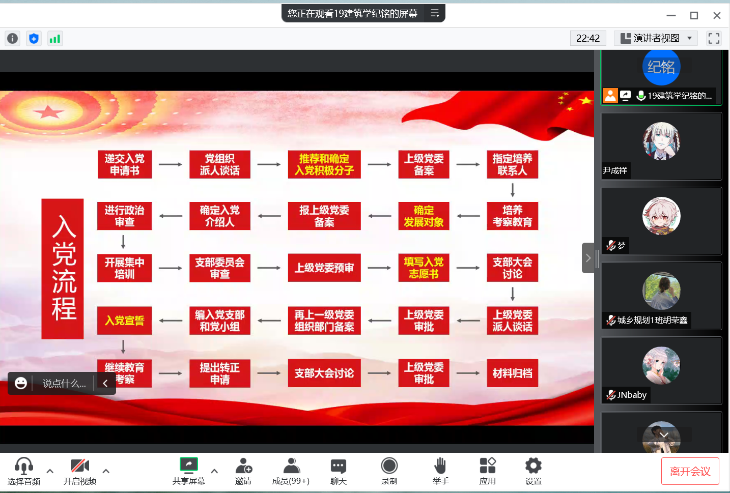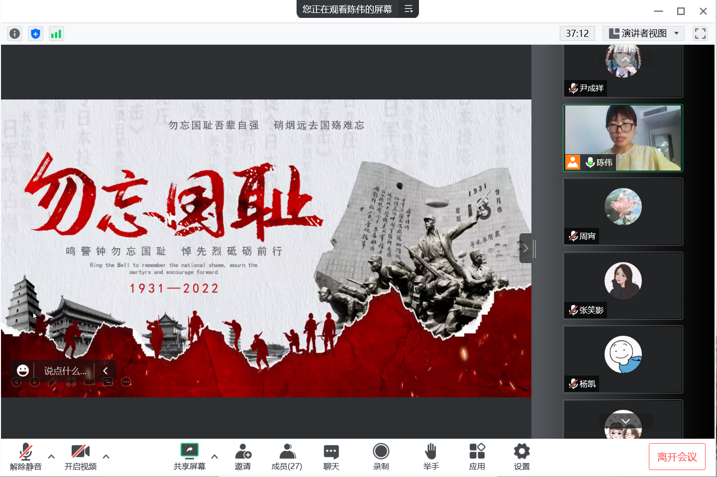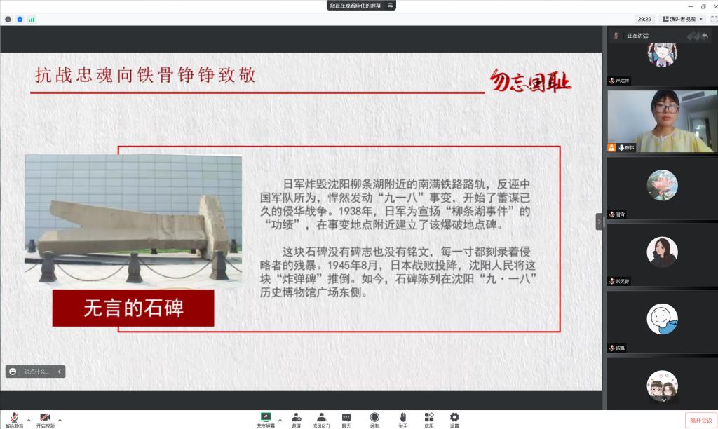 会上,beat365正版唯一官网全体党员及2022级大一新生团员聚集云端,共同重温历史,深入了解“九一八事变”的经过,回顾了革命先烈艰苦卓绝的抗战历程。陈伟讲道:“九一八事变”是日本帝国主义长期以来推行对华侵略扩张政策的必然的结果,也是企图把中国变为其独占的殖民地而采取的重要步骤。它同时标志着世界反法西斯战争的开始。我们通过这段历史,要居安思危,大力弘扬爱国主义精神,广泛进行爱党、爱国、爱社会主义思想政治教育,希望在座各位能铭记历史,勿忘国耻,牢记党员初心使命,做新时代合格共产党员。随后优秀党员代表纪铭为新生团员开展新生团员第一课,为同学们详细讲解入党申请流程,希望在场的团员能积极向党组织靠拢。