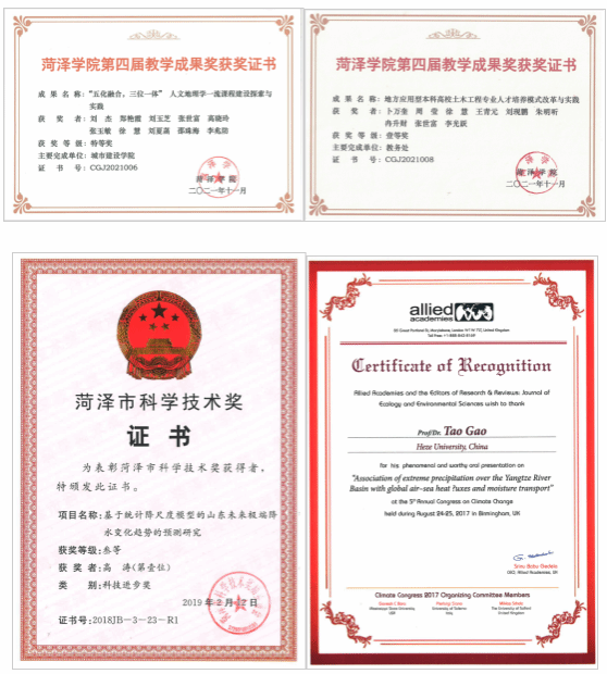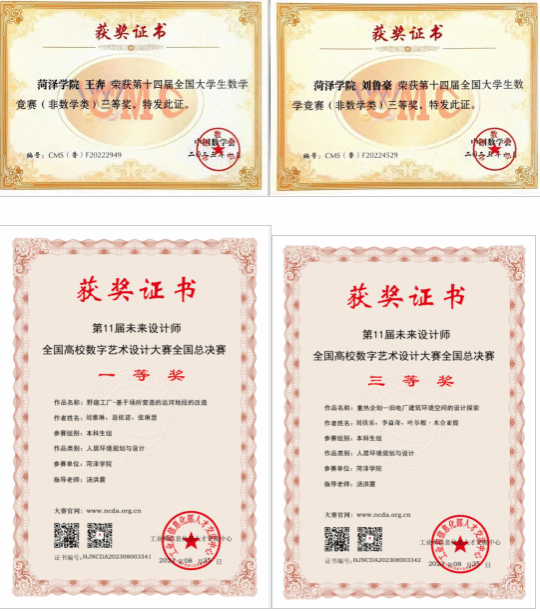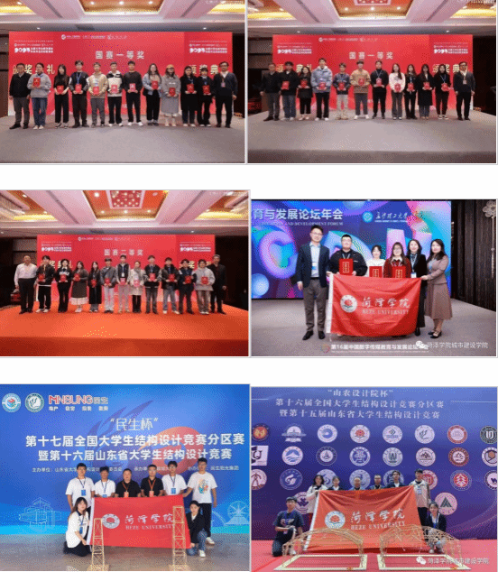 近几年,学院学生获得全国大学生数字媒体科技作品及创意竞赛国家级一、二等奖各3项,NCDA未来设计师·全国高校数字艺术设计大赛国家级一、三等奖各1项,全国三维数字化创新设计大赛国家级一等奖1项、二等奖3项,中国好创意暨全国数字艺术设计大赛国家级二等奖3项,两岸新锐设计竞赛“华灿奖”省级二、三等奖各2项,全国大学生结构设计竞赛省级一等奖1项、二等奖4项,米兰设计周-中国高校设计学科师生优秀作品展省级一、三等奖各1项,山东省大学生地理教学技能大赛省级二等奖10余项。
