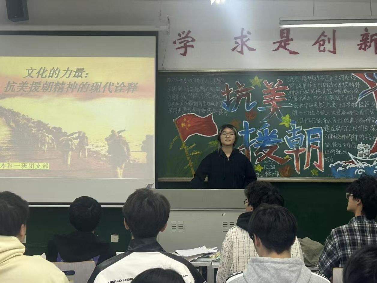 首先,由魏泽书带领大家观看思想学习宣传片,使同学们在视觉感受、言语互动和静心聆听中感受其深刻内涵。随后,魏泽书以PPT的形式,带领大家学习 “文化的力量:抗美援朝精神的现代诠释”,让同学们深入理解这一伟大精神,从中汲取力量,坚定理想信念,勇于担当作为。在思考与讨论环节,同学们积极探讨,纷纷表示在未来会将这种精神融入日常学习和生活中,以实际行动践行革命精神。