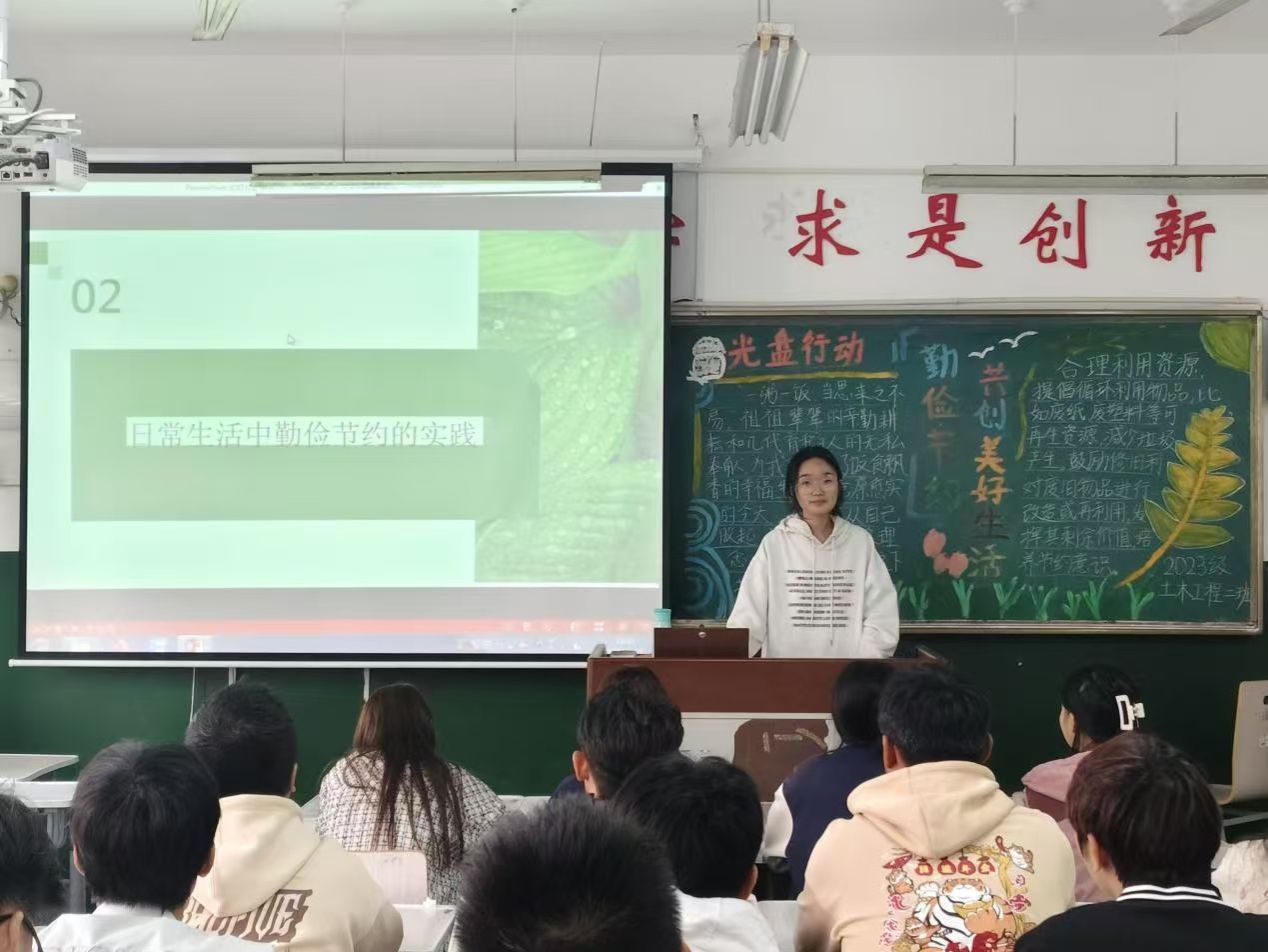 同学们齐聚一堂,怀揣着对 “勤俭节约,共建美好生活” 这一主题的期待,活动在热烈的氛围中拉开帷幕。丁硕从古代季文子 “以节俭为荣”的传统美德故事到现代社会中资源浪费的现状分析,让同学们深刻认识到勤俭节约的重要性。随后,丁硕带领大家观看 “勤俭节约,共建美好生活” 思想学习宣传片,引导各位同学深入思考,在分组讨论环节,现场气氛热烈。最后,主持人对本次活动进行总结,鼓励同学们将在活动中学到的知识和感悟融入日常生活,让勤俭节约成为习惯,使生活因节俭而更加美好。