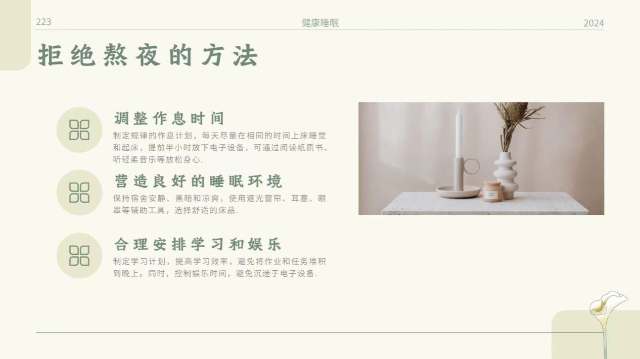 拒绝熬夜,守护宿舍十点半宁静,是对健康和集体生活尊重。需从自身做起,培养良好作息。可在十点半前合理安排学习娱乐时间,比如八点到十点高效完成作业或复习,再花点时间放松,如听舒缓音乐、做简单拉伸。十点半时,要放下手机、电脑等电子设备,其发出的蓝光会抑制褪黑素分泌、干扰睡眠,远离它们是迈向良好睡眠重要一步。