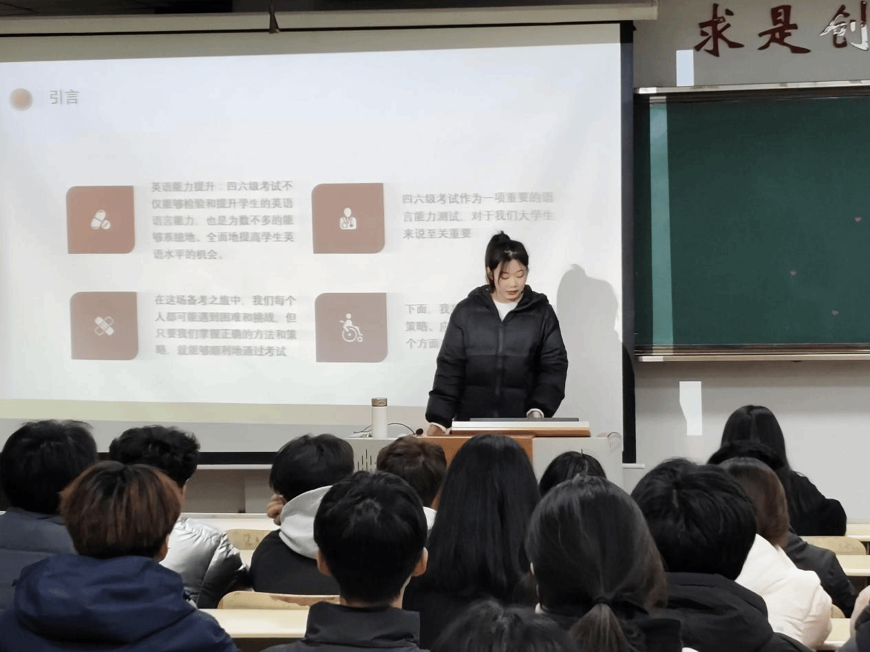 分享环节中,李晓慧学姐从考前准备、考试策略、考后反思等维度开展了深入指导,事无巨细地为同学们梳理了备考流程与注意事项。翟聪聪学长则深入浅出地解析四六级重点难点,针对不同题型传授独家应对秘籍,助力同学们精准突破。李静然学姐结合具体题目实操演练,以实例为同学们指明备考方向,让大家对考试内容有更直观的认识。