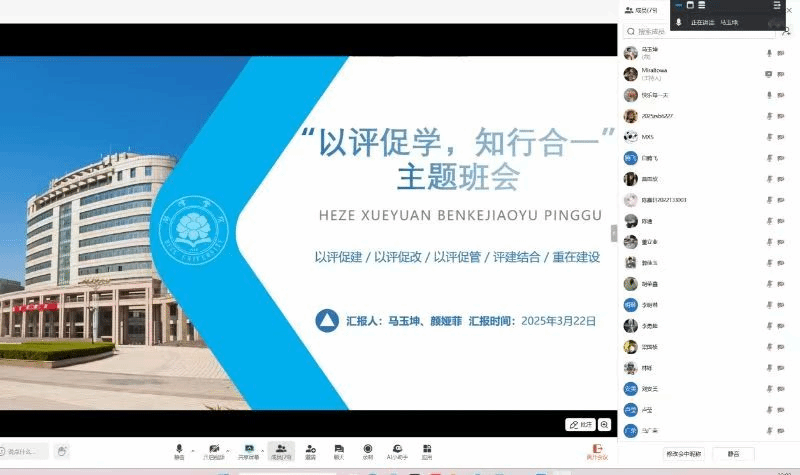 班会上,汇报人从以评促建、以评促改、以评促管、评建结合、重在建设五个方面详细解读了新一轮评估的核心目标,包括“一根本、二突出、三强化、五个度”的价值导向。“一根本”强调立德树人与德育成效的核心地位;“二突出”聚焦本科教育主线和五育并举的育人理念;“三强化”推动教学向“以学为中心”转型;“五个度”则从人才培养、社会需求等多维度提升教育质量,为构建中国特色高等教育质量保障体系奠定基础。班会特别强调学生需以实际行动支持评估工作,严格遵守行为规范,做到文明修身、知行合一,具体要求包括保持宿舍卫生、遵守课堂纪律、展现优良学风,并积极参与访谈、课堂评估及后续反馈等多方面。通过评估工作,学生们可清晰认知自身学习目标与不足,及时优化学习计划与方法,进一步增强学习动力,实现个人成长与学院发展的双向促进。