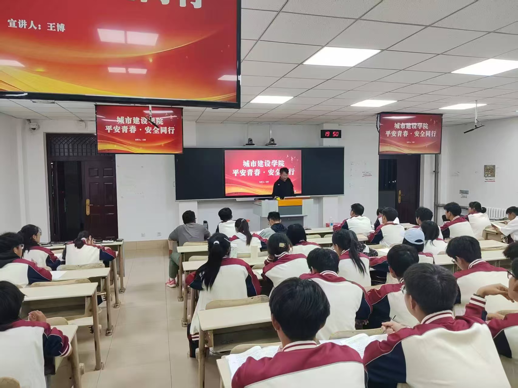 本次活动首先从学生日常学习生活出发,在宿舍安全方面,重点强调用电规范、设施保护与消防意识;在电信网络安全环节,揭示刷单返利、冒充客服等常见校园诈骗手法,并建议大家养成回拨官方电话、开启来电拦截等良好习惯;在人身与出行安全部分,关注交通安全、运动安全、实验室安全等的自我保护,以及台风、暴雨等极端天气的应对措施;同时还讲解了公共场所的消防要点、大型活动防踩踏技巧及电动车电池安全充电规范等。随后,在“强军有我,安全征兵”专题环节,王博为同学们详细解读了2025年征兵政策、军营成长路径及报名流程,鼓励大家将个人成长融入国家安全大局。