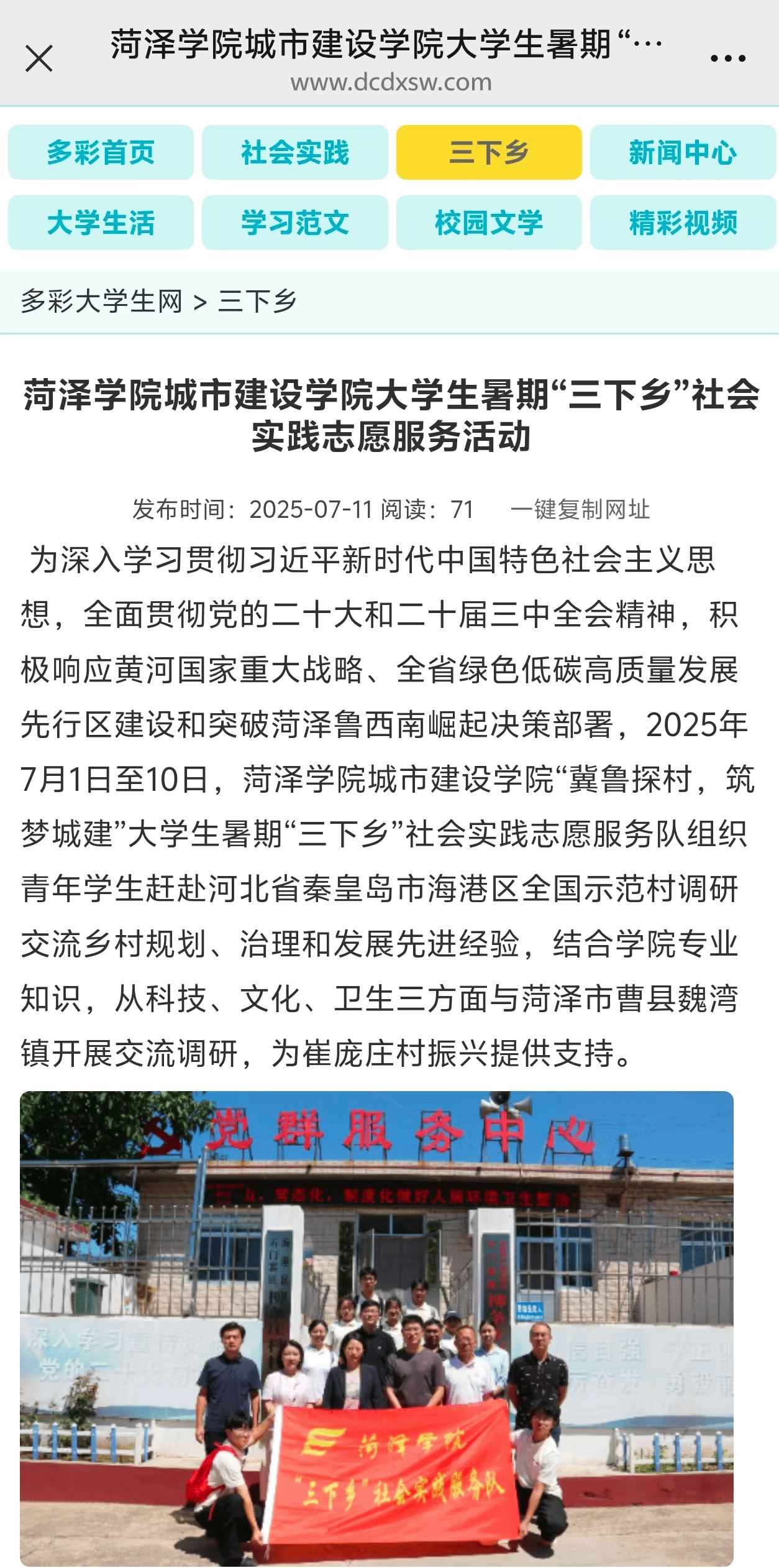 2025年7月,beat365正版唯一官网“冀鲁探村,筑梦城建”实践团开展大学生暑期“三下乡”活动。团队在刘兴飞老师的带领下,队员们跨河北秦皇岛、山东菏泽多地调研,发挥专业优势,为曹县崔庞庄村定制村庄规划与宅基地方案,普及智能就医、宅基地政策,运用GIS技术助力乡村优化,活动获省教育厅、菏泽市广播电视台等报道,同时也荣获省级重点团队的称号。既为乡村振兴注入了新活力,也展示了城建学子的担当与使命。