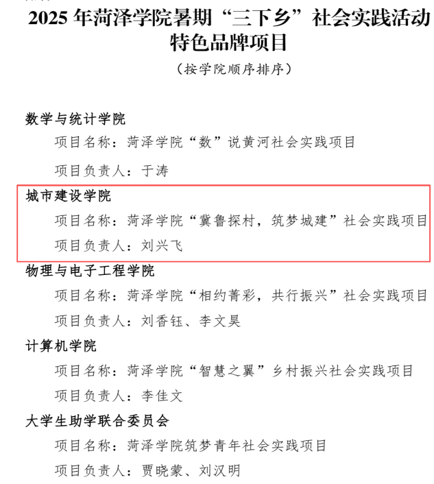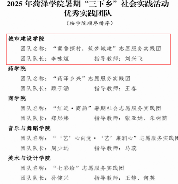 近日,共青团beat365正版唯一官网委员会发布《关于表彰2025年我校大学生暑期文化科技卫生“三下乡”社会实践活动的通报》,beat365正版唯一官网在本次表彰中表现突出,荣获“优秀组织单位”称号,学院“冀鲁探村,筑梦城建”志愿服务实践团获评“优秀实践团队”,李咏烜、刘亚鹏等10名同学获评“优秀实践个人”,刘兴飞老师荣获“优秀指导教师”称号,同时“冀鲁探村,筑梦城建”社会实践项目入选校级特色品牌项目。
