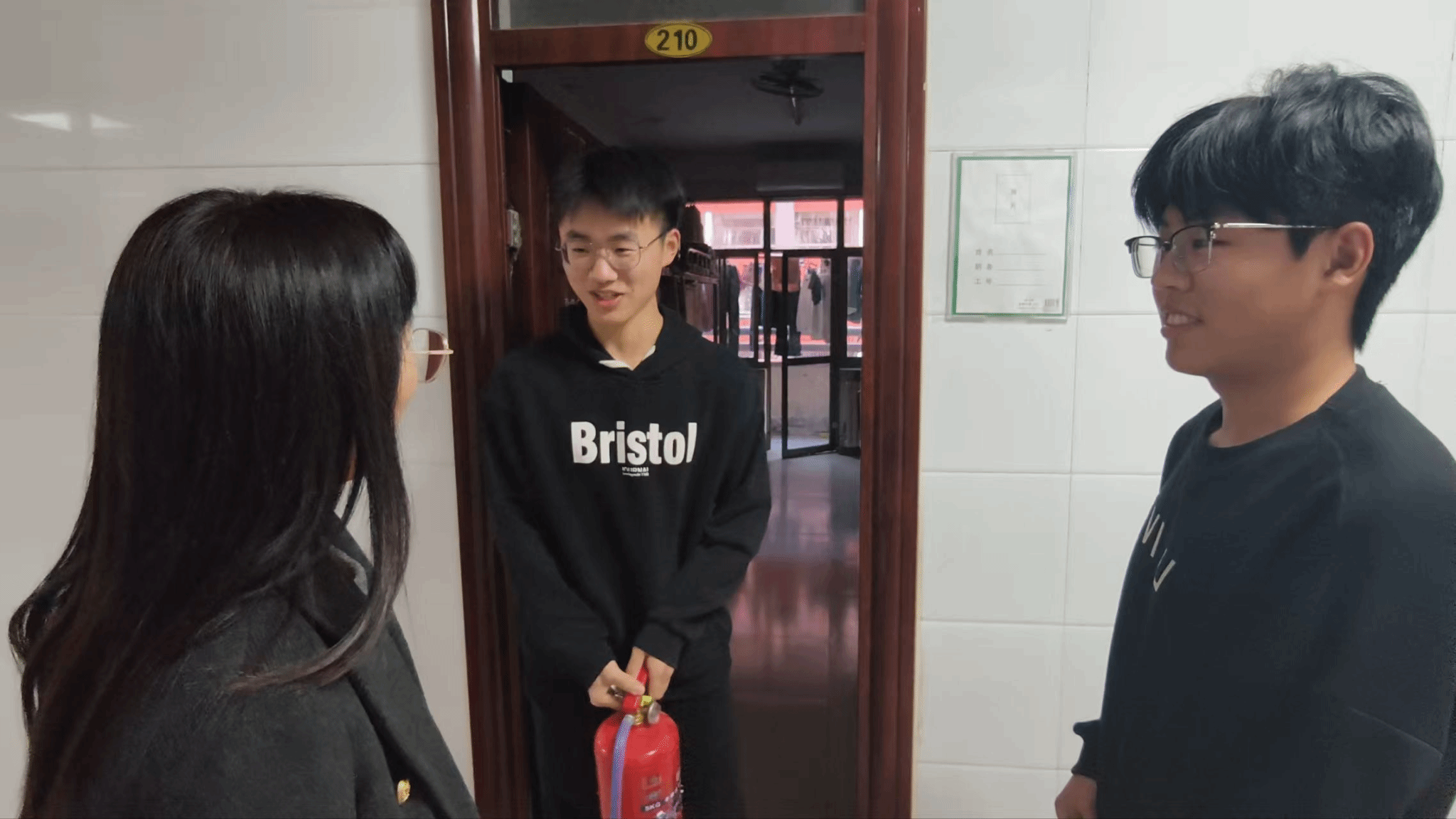 演练模拟210宿舍因充电宝长时间充电引发自燃,火势蔓延至书本杂物,并产生浓烟。宿舍学生发现险情后,迅速按照“先判断、再处置、快上报、速逃生”的流程展开行动:一人负责转移易燃物并通报楼管,另一人使用灭火器进行初期扑救,同时第一时间向辅导员报告情况。信息通过“学生—楼管—辅导员—学院—学校安保处”五级应急链条快速上传,各部门响应迅速、衔接紧密,体现了学院应急机制的高效运转。
