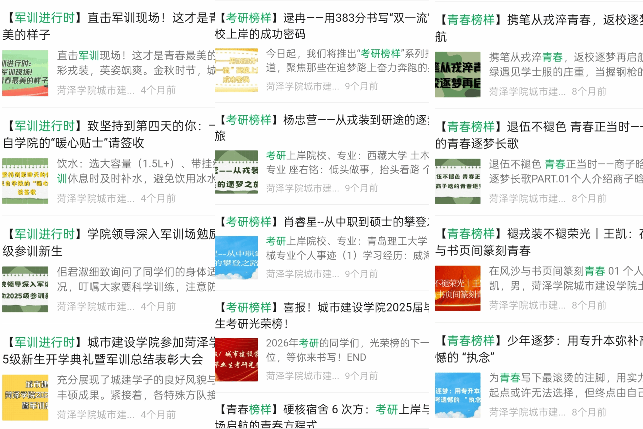 深耕品牌栏目,打造沉浸式育人载体,学院官微不仅是信息的发布者,更是网络育人的有效方式。运营团队准确把握时间节点,精准调研师生需求,策划推出了一系列现象级专题报道,其中,【军训进行时】——记录青春底色: 聚焦新生军训现场,通过图文、短视频等形式全方位展示城建学子的飒爽英姿与坚韧意志。其中,《直击军训现场!这才是青春最美的样子》单篇阅读量突破5500+,激发了新生的集体荣誉感。【青春榜样】【考研榜样】——传递奋进力量: 挖掘身边典型,推出专升本学子逆袭故事与考研上岸学霸专访。系列推文阅读量与转发量屡创新高,通过朋辈引领,在全院营造了“比学赶超、励志成才”的浓厚氛围。【研途领航】——赋能成长成才: 紧扣学生升学需求,系统推送考研经验分享、动员大会实况及复试调剂指南,为考研学子提供全流程的信息支持与精神动力,成为学生备考路上的“加油站”……