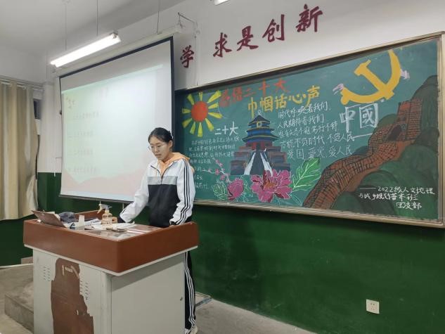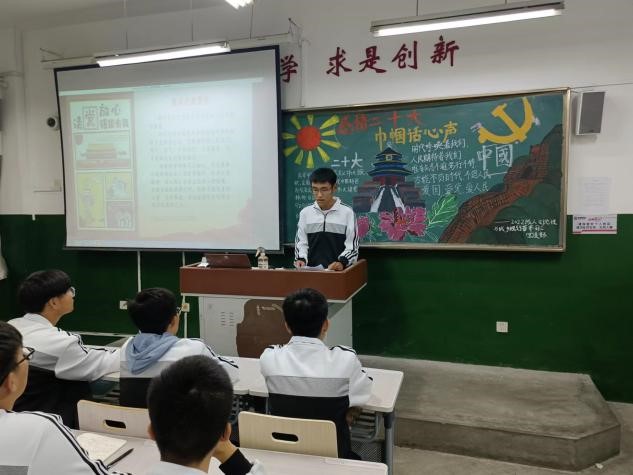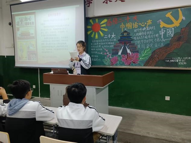 此次活动围绕党的二十大召开、党的二十大报告精神展开。刘小琳通过演示文稿向同学们传达了“红旗飘飘华夏,盛世繁于中华”的美好心愿。学生代表分享观党的二十大感悟,他讲到:作为新时代的接班人,我们要肩负起历史使命,抱有远大理想,努力提高自身素养,调整好自己的心态,摆正好自己的位置。活动最后,刘小琳总结了党的二十大报告精神对当代青年的勉励与期望。