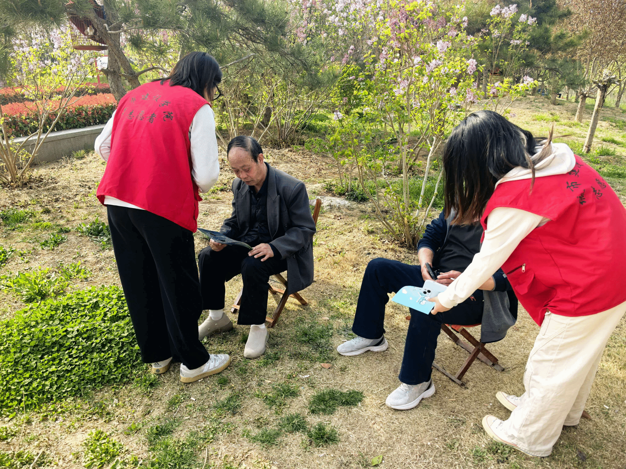 活动现场,志愿者们身着统一志愿服装,分组分片深入社区各个角落,通过发放宣传单、现场耐心讲解等方式,向过往居民全面介绍“爱心陪诊”小程序的功能、使用方法及服务流程。针对社区老年人普遍存在的“数字鸿沟”问题,志愿者们手把手教学,从小程序注册、陪诊服务预约,到就诊流程指引、后续服务反馈,逐一拆解操作步骤,用通俗易懂的语言解答居民关于陪诊服务范围、预约时效、服务保障等各类疑问。同时志愿者们还精心准备鲜花与手工纸板,为爷爷奶奶们拍摄春日纪念照,定格温暖笑容。活动中,大家耐心陪伴老人,用镜头记录下长辈们的幸福瞬间。