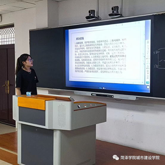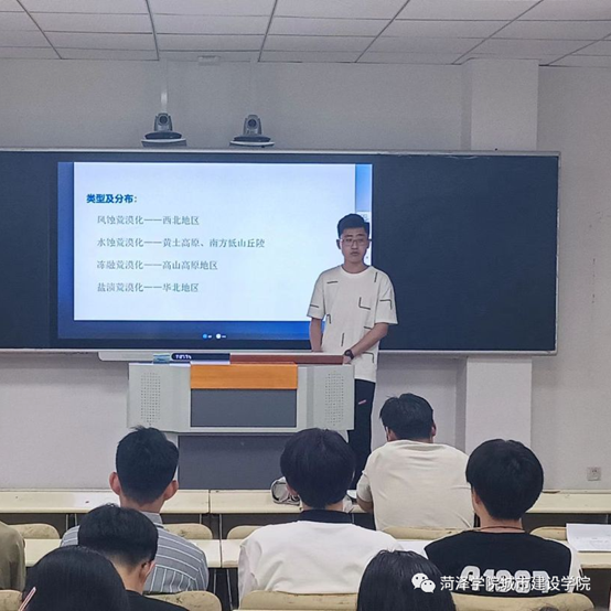 预演赛流程依照山东省地理教学技能大赛规则与要求开展,21级参赛选手从“世界气候类型”与“城市化及其特点”两个课题中任选其一,22级参赛选手从“地球的自转”与“荒漠化的危害与治理”两个课题中任选其一,比赛开始前,参赛人员通过现场抽签的方式决定出场顺序,选手须在15分钟内进行PPT展示、课题讲解,讲解结束后,指导老师依据选手的试讲或说课内容进行相应的内容提问。比赛过程中,选手们的思路清晰,思维层层递进,仪态自然大方,板书书写工整,多媒体运用流畅,现场互动热情高涨,呈现出独具特色的课堂教学效果。经过选手们的展示,指导老师根据暴露出的问题提出改进措施,以便参赛选手在后期的比赛中表现得更加出色。