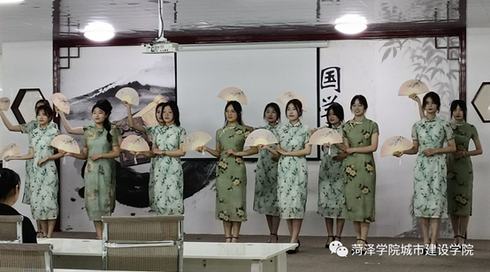 活动伊始,主持人宣布登场后,同学们身着统一的旗袍服饰,步伐统一的走向舞台中央。随后,她们以队伍中间的同学为中心,伴随着音乐节奏,对称着向前走,不断变换着位置,一颦一笑间,尽显自信与韵美。同学们都毫无保留的表现自己,迈着优美的步伐,举扇、翻转、转身、合扇,身姿曼妙,将“美”一字展现地淋漓尽致。展示结束后,李萍老师对同学们做出了评价,并从动作、仪态、面部表情等方面以身示范,她希望同学们能够全身心融入音乐韵律中,使同学们对身着旗袍时的步法有了更深刻的理解。