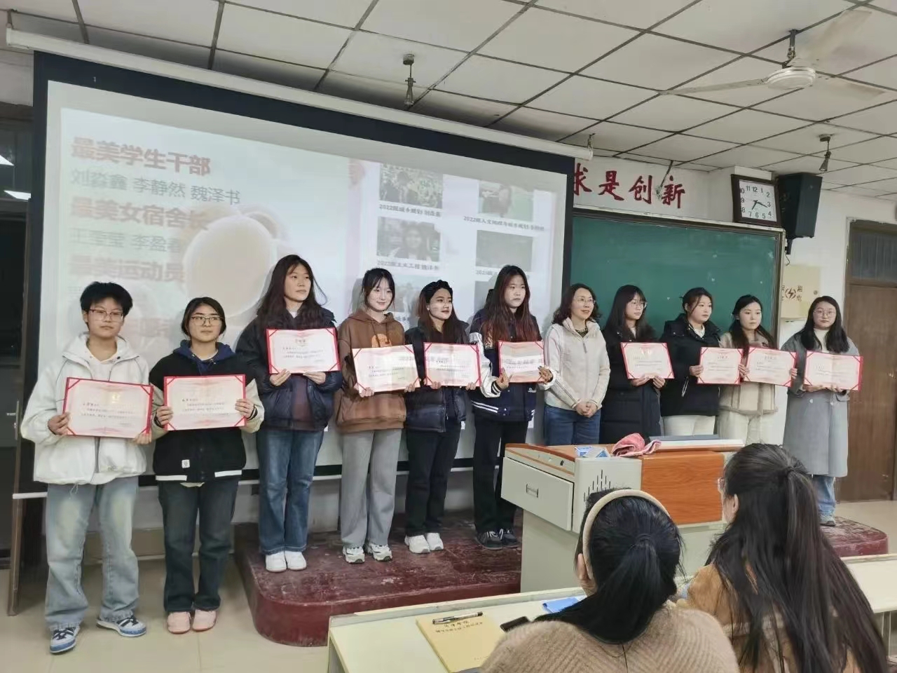 座谈会伊始,主持人李静然通过PPT介绍活动环节,讲述城建半边天的优秀事迹,阐释善良、独立、自尊、自爱的含义,鼓励女性同学们撕掉标签,做不被定义的自己。刁永鸽为2024城建十佳女生颁发证书。优秀代表谈获奖感言,与在座同学分享自己的经验。在师生互动环节上,同学们就困惑自己的问题向老师寻求答案,期间欢笑、掌声不断,大家沉浸在温馨欢乐的氛围中。在此过程中,老师们对自己感兴趣的话题与大家进行了深刻讨论,该环节不仅是师生之间的解惑,更是两代知识女性之间的深度交流。同学们的困惑得到解答的同时也能够更深层次地领悟到女性力量的魅力。男生祝福节目环节上,大家纷纷拿起手机记录下这一刻的美好,留住属于此刻的高光。最后,刁永鸽对与会师生献以诚挚的祝福,她强调,作为当代女大学生,要重视学习,关注自身思想素质、道德修养、文化内涵、心理健康等,要德智体美劳全面发展,做到口中有德、眼中有人、心中有爱、行中有善,要拥有勇气、才气、正气、大气,做到“自尊、自信、自立、自强”的同时学会保护自我、发展自我。