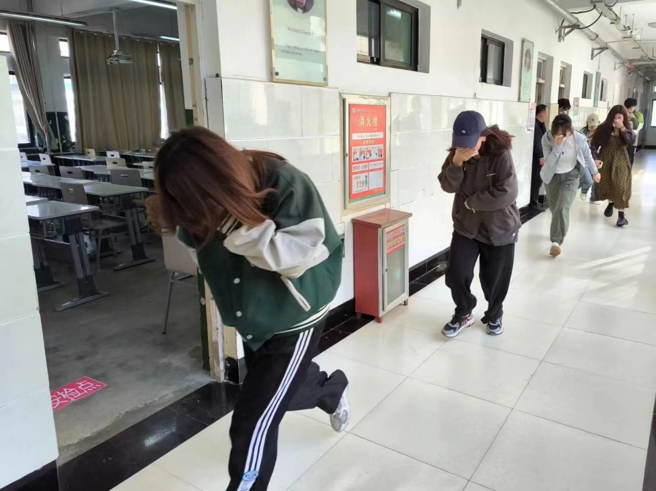 随着警报声响起,任课老师快速做出应对,引导同学们迅速有序地从教室中撤离,各楼层指挥疏散人员沉着冷静地指挥同学们有序逃生,所有人员手捂口鼻、沿安全通道以弯腰靠墙的方式快速有序撤离至安全区域。整个疏散过程安全迅速、秩序井然,各环节之间衔接紧密,楼宇内全体师生顺利完成安全疏散,本次消防安全逃生疏散演练取得了圆满成功。