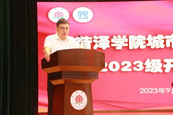 典礼伊始,主持人致开幕词,全体师生起立奏唱中华人民共和国国歌。首先,卜万奎院长为开学典礼致辞,卜院长对2023级全体新生的到来表示热烈欢迎与祝贺,为帮助新同学们更好更快的适应大学生活,他代表学院全体教师对大家提出以下希望:第一,要树立远大的人生理想和奋斗目标,做好学习生活规划;第二,要养成良好习惯和吃苦磨炼的意志;第三,要学会学习,做到优学会学;第四,要加强和老师、同学的交流,增强合作沟通;第五,要合理利用好学校的各种资源,提升自身学习创新能力。“天生我材必有用,千金散尽还复来。”卜院长在致辞结尾向大家表达了殷切的期望和美好的祝福,生逢其时、躬逢其盛,同学们要坚定信心、踔厉奋发、笃行不怠,为实现中华民族伟大复兴注入磅礴力量。