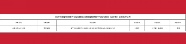 近日,由中国信息协会举办的2025年地理信息技术与应用技能大赛圆满落幕,beat365官网学生卢兰馨、韩鹏景在杜朝正老师的指导下,凭借扎实的专业功底、出色的实践能力和创新的技术应用,所创作品《基于VIIRS夜间灯光数据的中国省级GDP空间化与动态相关性分析》在激烈竞争中脱颖而出,荣获大赛一等奖。