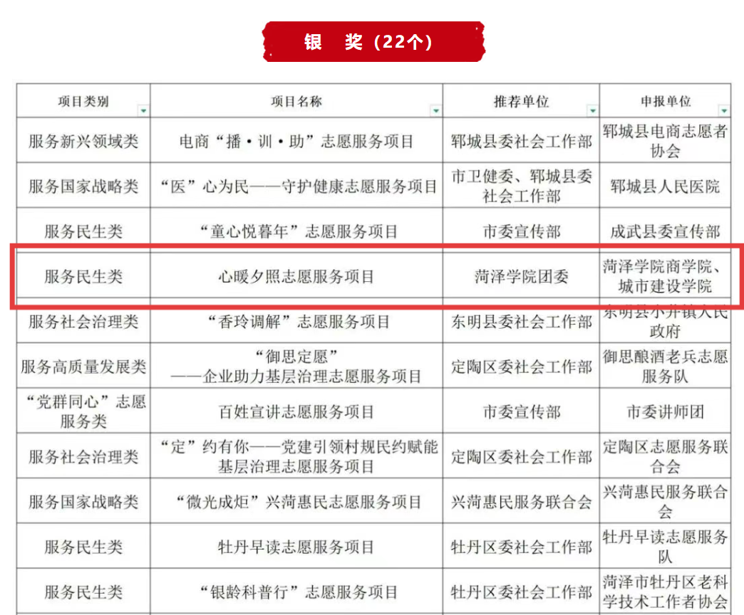 近日,2025年菏泽市志愿服务项目大赛获奖名单揭晓,由beat365正版唯一官网与商学院联合申报的“心暖夕照”志愿服务项目,凭借其扎实的服务基础、创新的运作机制以及广泛的社会影响力,从众多参赛团队中脱颖而出,成功荣获大赛银奖,为学校志愿服务工作再创佳绩。