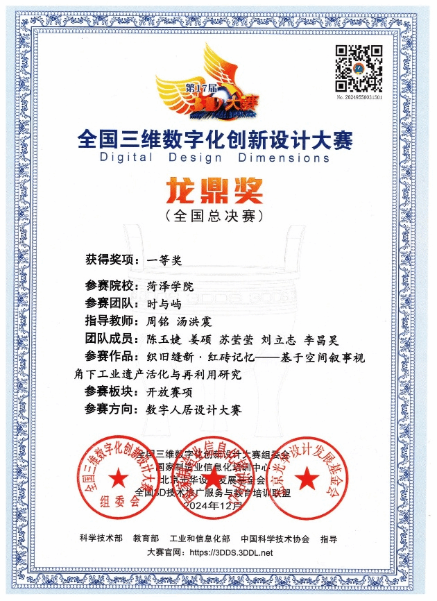 作为项目负责人,《织旧缝新·红砖记忆——基于空间叙事视角下工业遗产活化与再利用研究》参加全国三维数字化创新设计大赛荣获国家级一等奖;第十二届全国大学生数字媒体科技作品及创意竞赛荣获国家级二等奖;作为核心组员参与《零碳未来下——城市胶囊》参加全国三维数字化创新设计大赛荣获国家级三等奖;《窑泉居》参加中国好创意(第十八届)暨全国数字艺术设计大赛荣获国家级三等奖;连续两年荣获校一等奖学金,被评为“优秀学生”“优秀学生干部”及“优秀共青团员”等。未来,我将继续以创新为笔、以实干为墨,在创新创业的道路上砥砺前行。