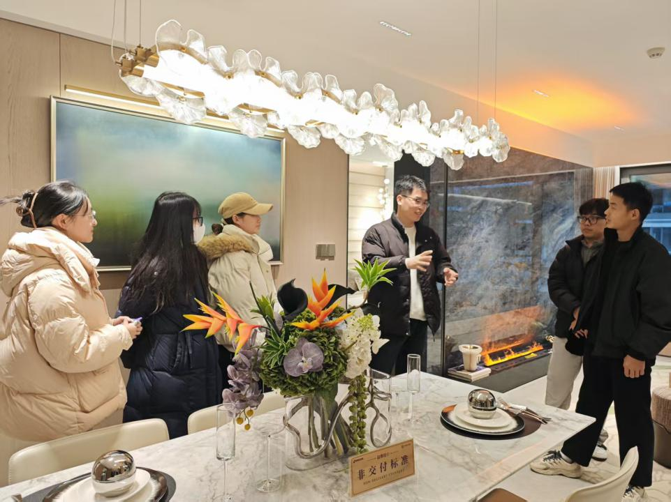 随后,在讲解员的带领下师生深入小区,重点参观了150㎡和126㎡两种户型样板房。同学们专注聆听讲解员对户型结构、空间布局、采光通风、功能分区及装修材质的讲解,结合专业理论对空间设计的合理性与实用性进行了分析。同学们踊跃提问、积极探讨,老师与讲解员耐心解答,现场交流氛围热烈。