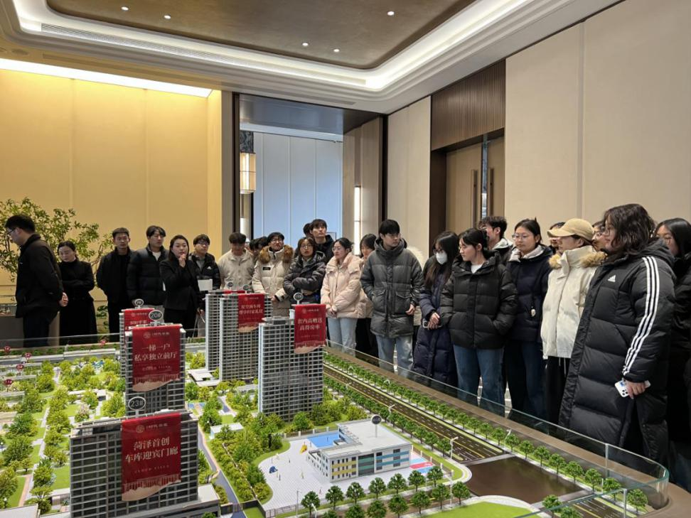 活动伊始,讲解员借助多媒体向大家详细介绍了小区的整体规划布局、建筑风格定位、容积率与绿化率等核心指标,以及项目在生态宜居、智能社区等方面的设计亮点。通过动态演示与图文解析,同学们对小区的整体情况建立了初步认知,为后续实地参观奠定基础。