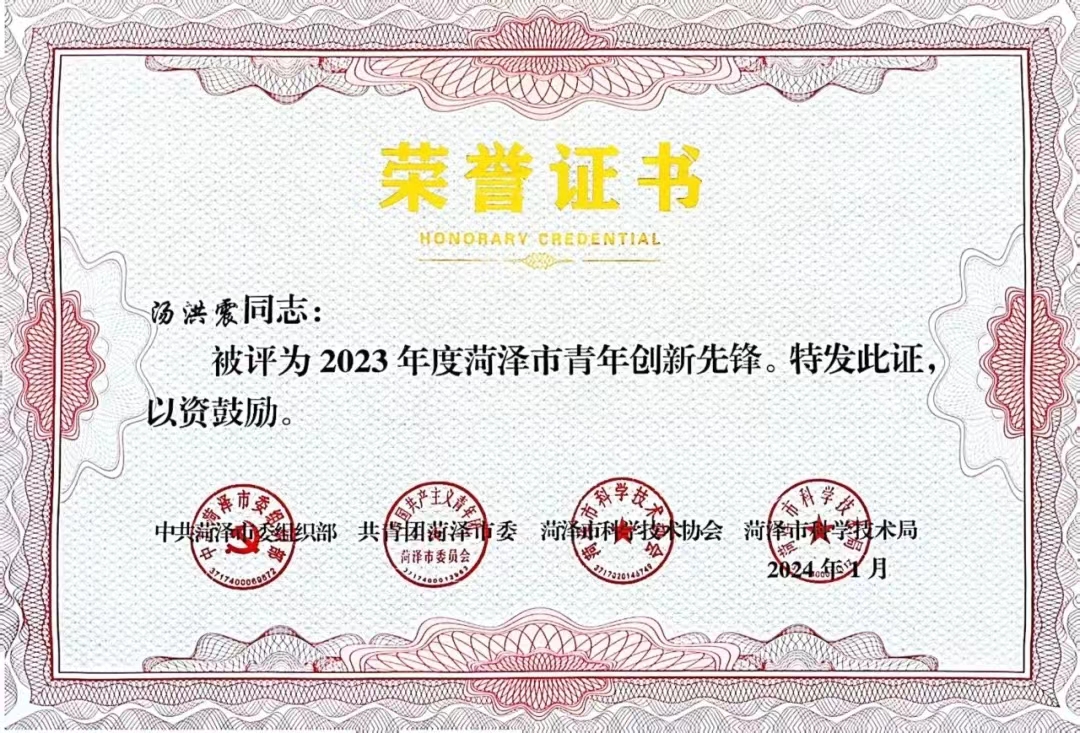 近日,共青团菏泽市委发布了《关于表扬2023年度“菏泽市青年创新先锋”“菏泽市青年创新工作室”“菏泽市优秀青年创新成果”的通报》,我校汤洪震老师被评为2023年度菏泽市青年创新先锋。