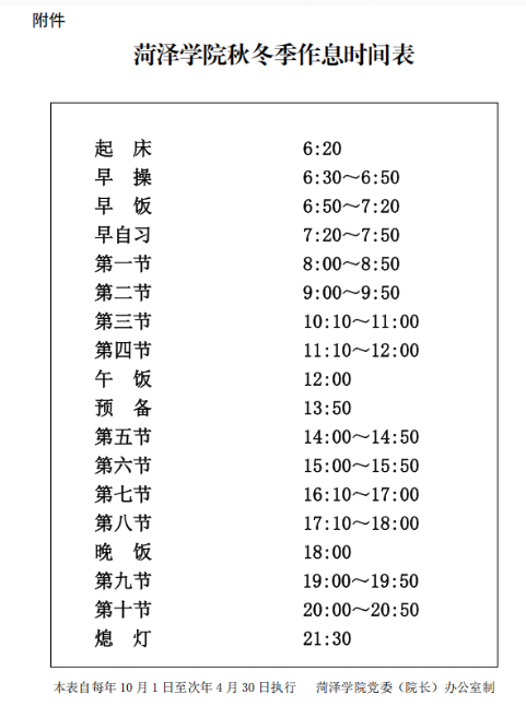 3.自 10 月 1 日起执行秋冬季作息时间(见附件)。